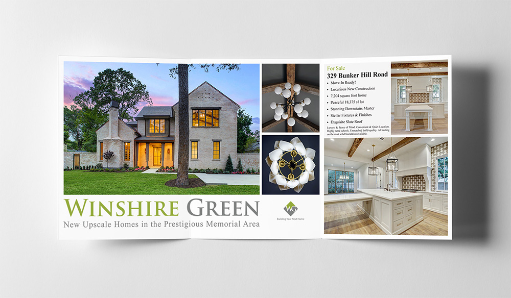 Winshire Green built high end homes in Houston’s Memorial area.The trifold brochure above was created to highlight the key